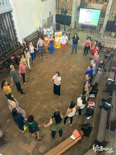 Nesse caso, as mesmas brincadeiras da oficina para as crianças são vivenciadas, mas a abordagem é voltada para reflexão sobre a prática pedagógica, sobre a BNCC e as possibilidades de se trabalhar as brincadeira na sala de aula.
